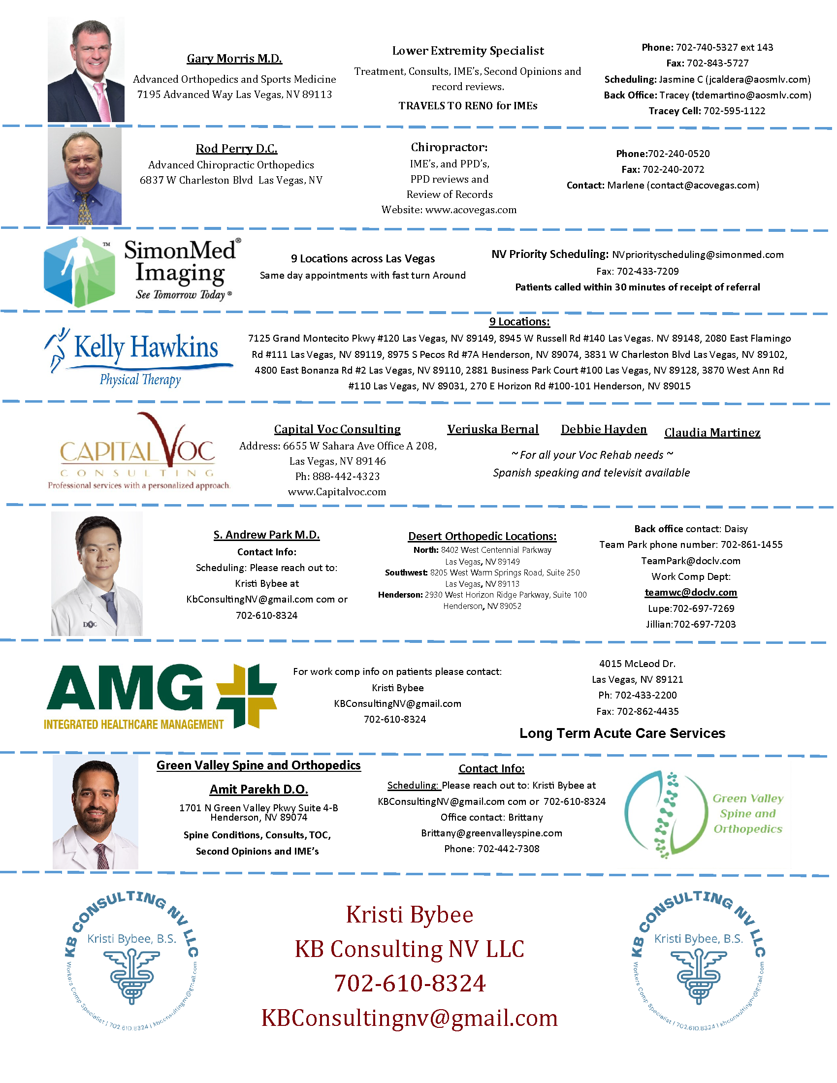 My name is Kristi Bybee. I am the Owner/CEO at KB Consulting NV. I work with physicians, hospitals and medical facilities to educate them regarding workers compensation. I help the physician to understand the verbiage and assist them in understanding the in’s and out’s of workers comp. I also train the front office staff on what information is needed to make appointments and how to maneuver through workers comp. I work with back office staff to make sure they have all the forms and information they need to make the clinic run smoothly. I also contract and credential the physicians and facilities with the NV workers comp networks. Finally, I market to all those involved in workers compensation in order to bring patients into the facility. Please let me know if I can be of assistance to you or your group! I’d be happy to talk!!